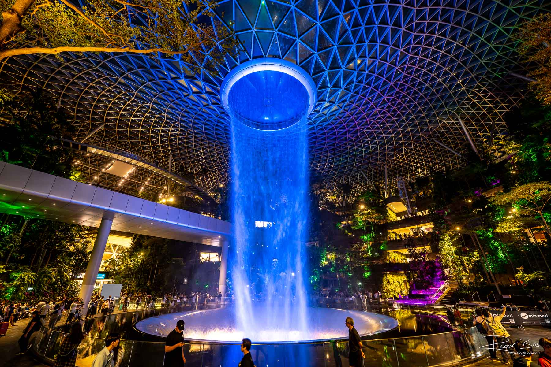 The Jewel Changi Airport waterfall at night. A must-see location for architectural photographers visiting Singapore. There is a lightshow and even a pilatus class – right there!