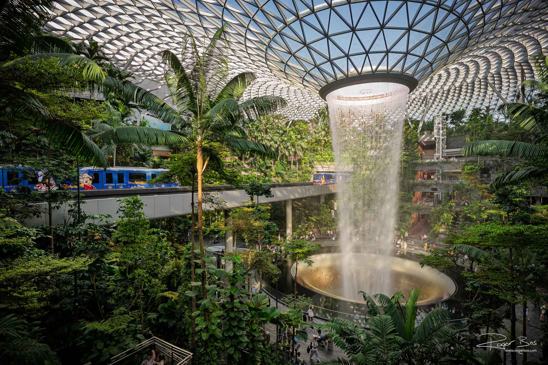 Indoor waterfall at Jewel Changi Airport with glass dome and tropical garden, Singapore architectural photography