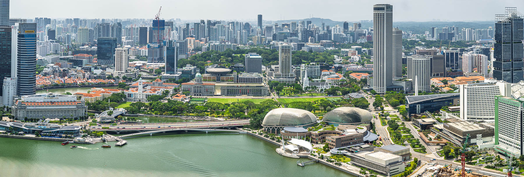 Panoramic view of Marina Bay Singapore with skyline, river and modern architecture
