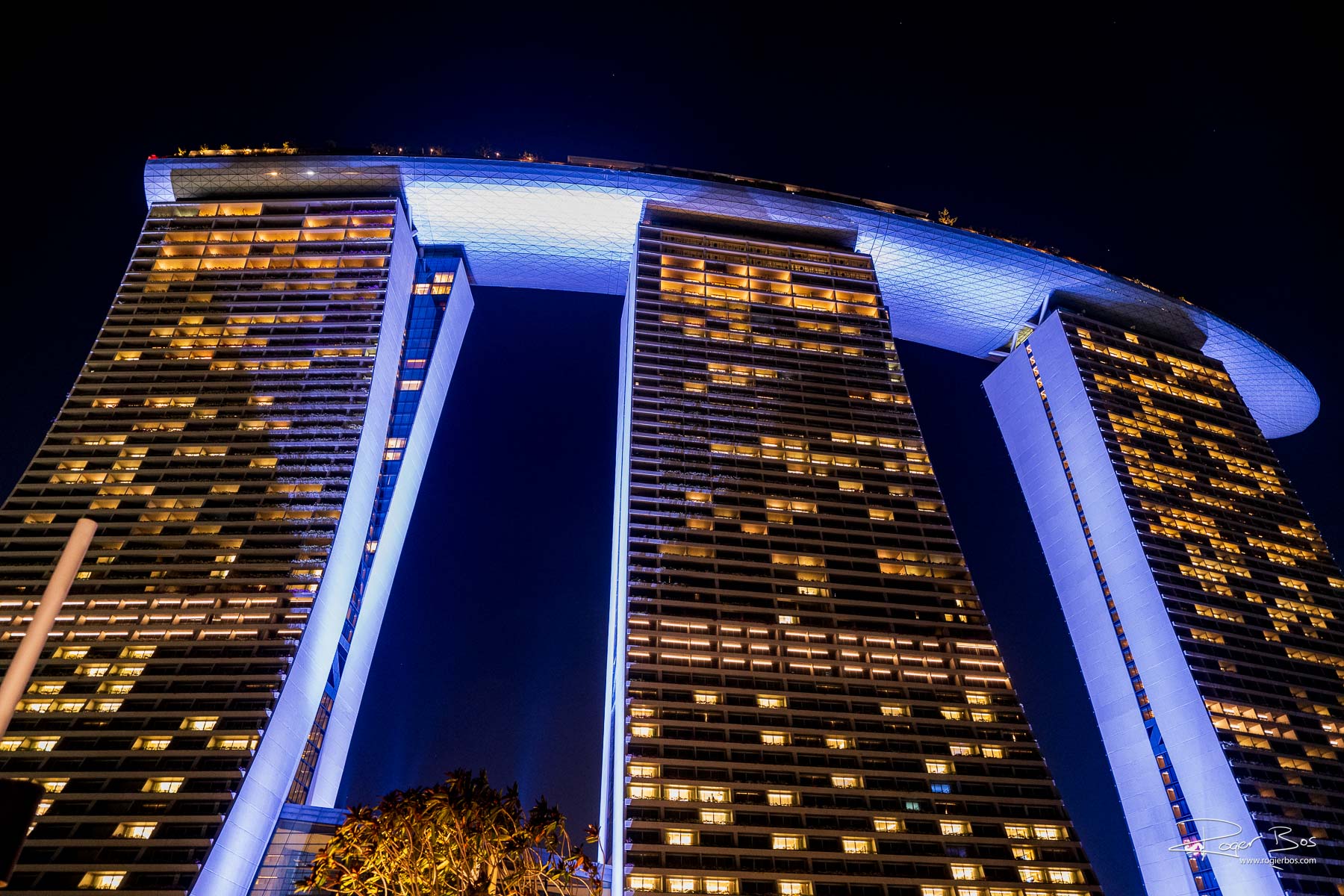 After the light show ends there is a fountain show on the other side of the Marina Bay Sands Hotel. So the whole crowd moves there. It’s a bit of a walk, but you pass underneath the observation deck of the hotel, which is even more impressive at night. The fountain show is also amazing — but near impossible to photograph. So, no pictures 🙂
