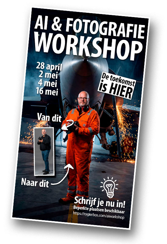 Ik ben er van overtuigd dat AI een enorme impact gaat hebben op ons vak. Wat we nu zien is nog maar het tipje van de ijsberg. ik zie teveel fotografen hun kop in het zand steken, terwijl steeds meer klanten verwachten dat je AI kan aanwenden. In deze workshops hoop ik jou als fotograaf op weg te helpen om AI een plaats te geven in je fotografie. Nee, je hoeft niet alles te kunnen. Maar je gaat waarschijnlijk ontdekken dat AI ook voor jouw bedrijf echt meerwaarde heeft!